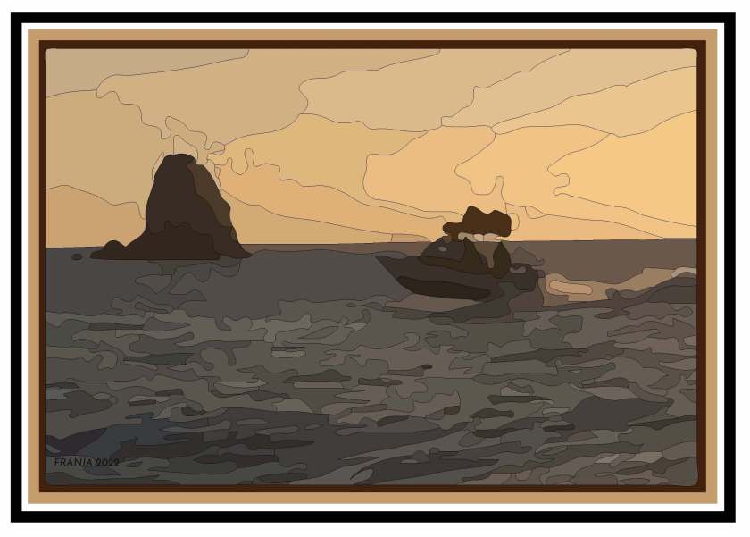 Inspired by a photo my good friend Bill Kindle took shortly after the start of the Catalina Classic Paddleboard Race. This rock is near the Isthmus, and I was aboard this Boston Whaler with a very young knowledgeable and fearless captain, Kyle Morgan.